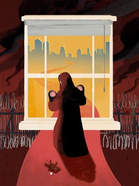 مها وعبدالله هما آباء لخمسة أطفال، من درعا، حيث بدأت الحرب الأهلية السورية في عام 2011 بعد أن قام صبية مراهقون برش كتابات مناهضة للحكومة على جدار مدرسة ثانوية. تم احتجاز الأولاد وتعذيبهم لعدة أسابيع، واستنكر الشعب هذا النهج المتشدد وبالتالي أثار الاحتجاجات في درعا والتي بدورها انتشرت في جميع أنحاء البلاد. عندما غادرت مها وأسرتها سوريا، كان أصغر أطفالها هما توأمان يبلغان من العمر 40 يومًا فقط، فعبرت أولاً إلى الأردن وعاشت هناك لأكثر من عام قبل المجيء إلى الولايات المتحدة. ما جعل مها في حيرة من أمرها في هذا المكان هو عدم ظهور وتواصل الجيران منذ عدة أسابيع، ولكن مع الوقت، علمت أنه ليس من عادة الناس في بالتيمور الإجتماع خلال فترة ما بعد الظهر أو في الليل على الشرفات للحديث ومشاركة الطعام. بالرغم من ابتعادها عن بلادها، تحرص مها على إبقاء سوريا حية في قلوب أبنائها من خلال محادثات الفيديو المعتادة مع أبناء عمومتهم في سوريا وكذلك من خلال الأطباق التي تعدها لهم يوميًا. من أشد الآلام التي تطغى على مها بسبب مغادرتها سوريا هي أنها لم تعد قادرة على زيارة قبر ابنتها ملك التي توفيت وعمرها سنة واحدة. (الفنان: جيانان ليو)